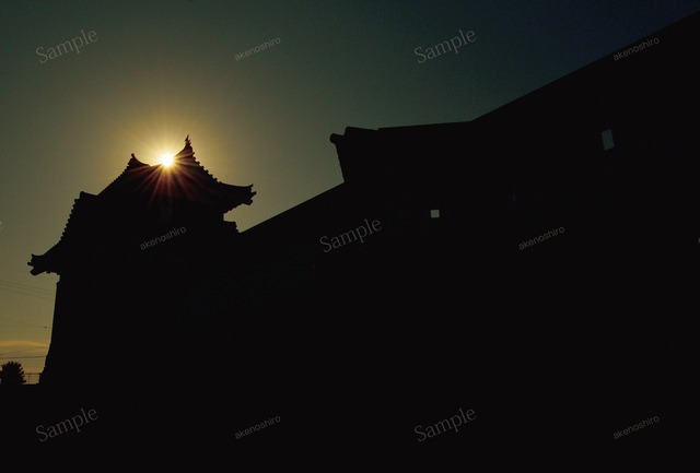 足助城の第2弾は、日輪を頂く足助城(愛知県豊田市)です。 昇ってきた旭日がちょうど櫓の屋根に掛かったところです。 大気中の水分の関係でしょうか。 光芒は拡がらず、丸い光となった太陽が屋根の上に乗っています。 少し縦長に写っているのも大気の関係のようです。 さて、 日輪を頂く「足助城」の画像データです。 年の初めのご挨拶などにいかがでしょう。 ーーーーーーーーーーーーーーー 官製ハガキ(年賀はがき)サイズ 100mm × 148mm 300dpi PNG形式保存(RGB) ★携帯端末からはご利用頂けません★ ーーーーーーーーーーーーーーー