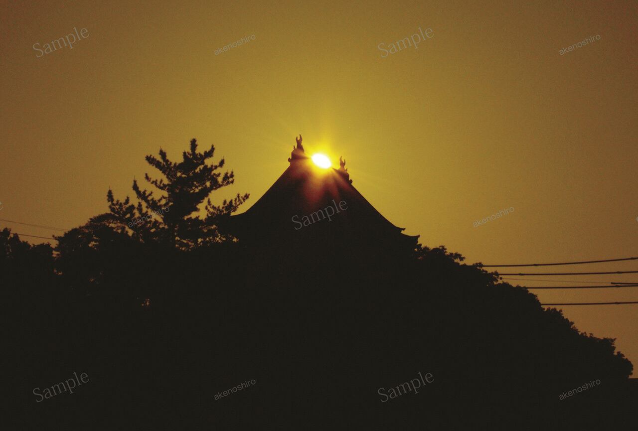 挙母城(愛知県豊田市)に昇る旭日、「ダイヤモンド挙母城」のハガキサイズのpngデータです。